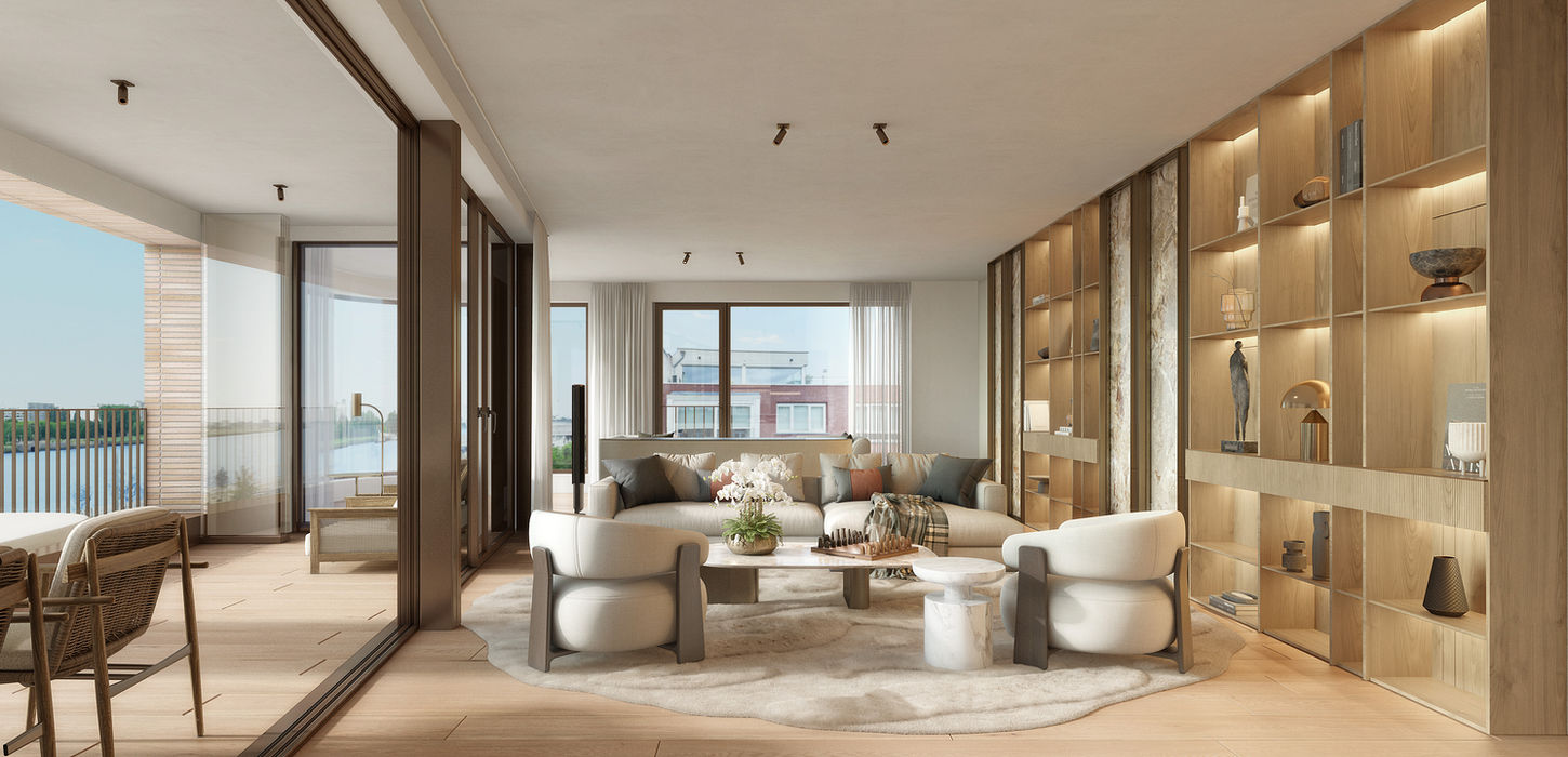 De appartementen van Plantinkaai verrassen door hun overvloed aan lichtinval en door hun uitzonderlijke hoekligging aan de Schelde. een absolute zeldzaamheid op zo’n locatie in de stad. Ruimte, licht en comfort vormen de rode draad, en dat geldt bij uitstek voor het prestigieuze penthouse dat de volledige bovenverdieping in beslag neemt.