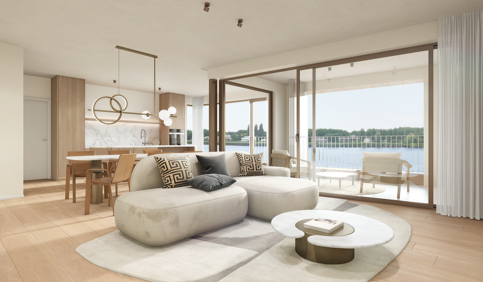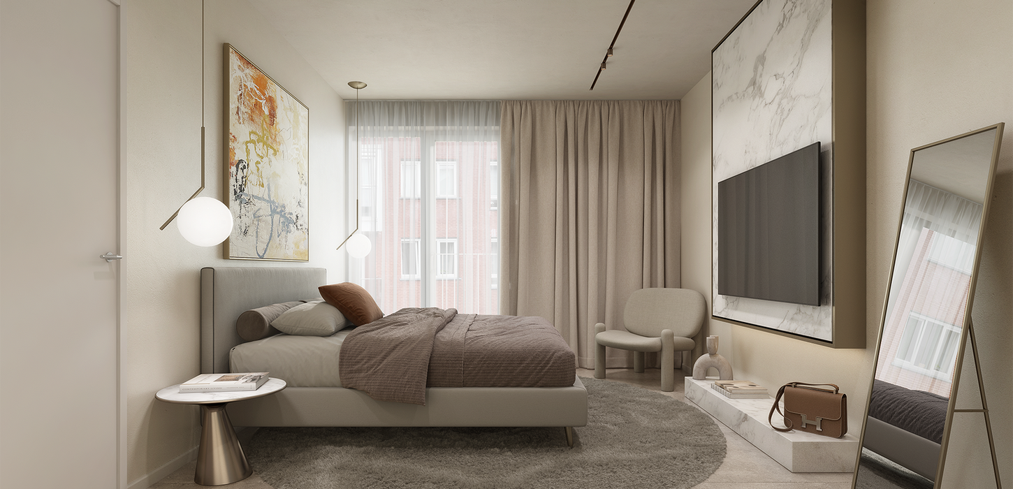 De royale raampartijen en de brede gevel langs zowel de Plantinkaai als de Vlaanderenstraat laten het daglicht overvloedig binnenstromen en garanderen een zalig gevoel van openheid. Vanuit de hoekappartementen geniet je niet alleen aan de voorzijde, maar ook langs de zijkant van het panoramische uitzicht.